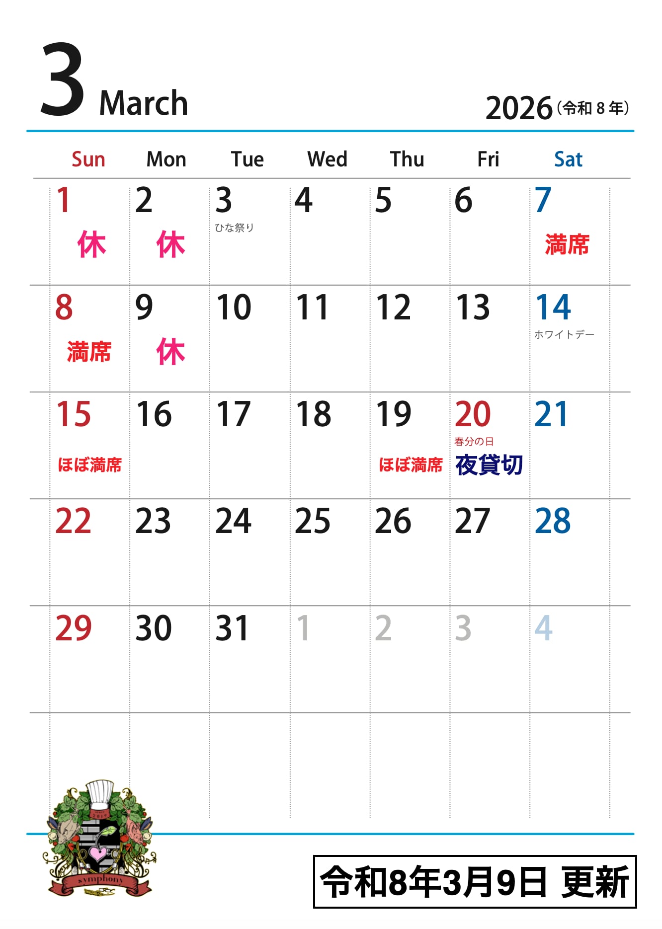 営業日(休日)カレンダー | 加治木の小さなレストラン Symphony
