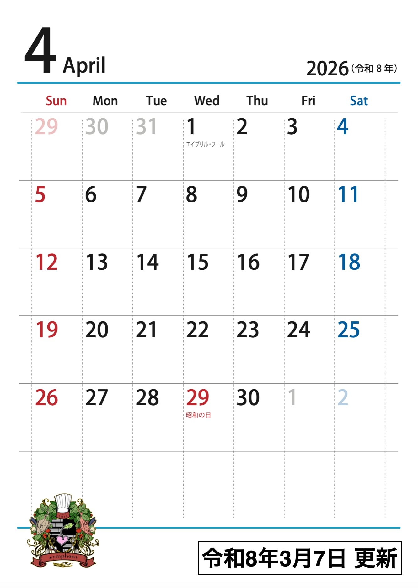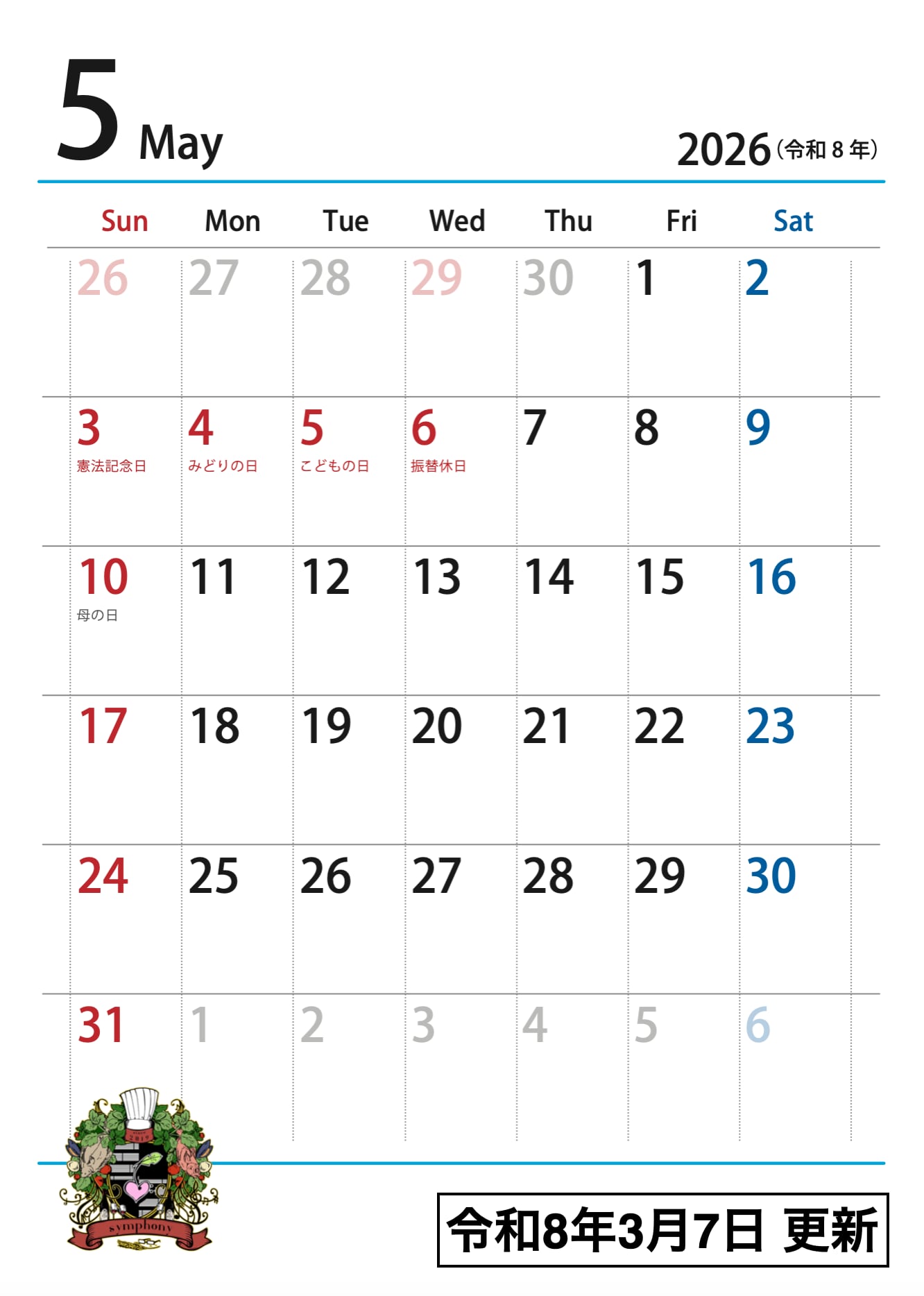 加治木の小さなレストラン Symphonyは不定休のお店です。ご来店の際は営業日カレンダーをご確認ください。お店がお休みの日はカレンダーに「休」と表記しております。